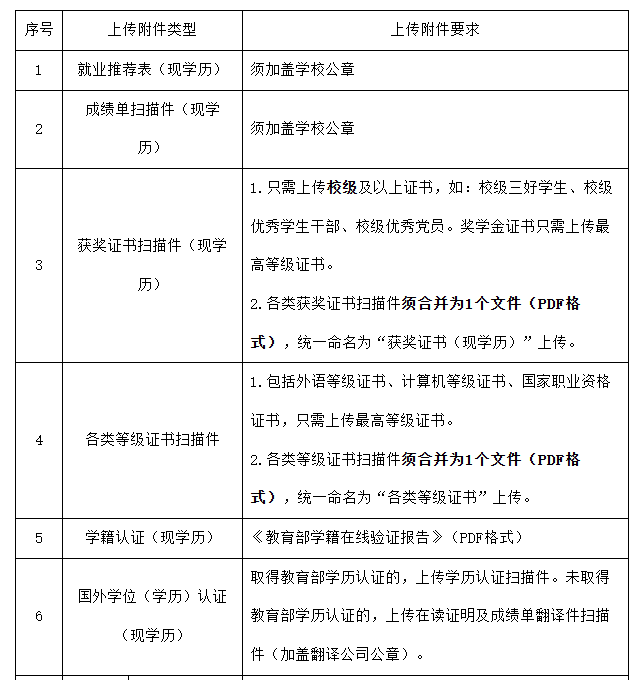 3.上傳應(yīng)聘附件材料。應(yīng)聘畢業(yè)生須通過(guò)招聘平臺(tái)及時(shí)、規(guī)范上傳個(gè)人應(yīng)聘附件材料,應(yīng)聘附件材料文檔數(shù)量不超過(guò)7個(gè)。應(yīng)聘畢業(yè)生應(yīng)確保應(yīng)聘材料能正常打開、清晰顯示,因應(yīng)聘材料不能正常打開、圖像不清晰或未按規(guī)范要求填報(bào)導(dǎo)致的結(jié)果由應(yīng)聘畢業(yè)生本人承擔(dān)。上傳附件具體要求如下: