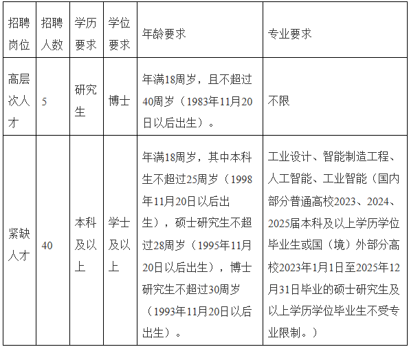 1.具有寧波市戶籍或生源,所學(xué)工業(yè)設(shè)計(jì)、智能制造工程、人工智能、工業(yè)智能專業(yè)的國(guó)內(nèi)普通高校2023、2024、2025屆本科及以上學(xué)歷學(xué)位畢業(yè)生或國(guó)(境)外高校2023年1月1日至2025年12月31日畢業(yè)的碩士研究生及以上學(xué)歷學(xué)位畢業(yè)生。