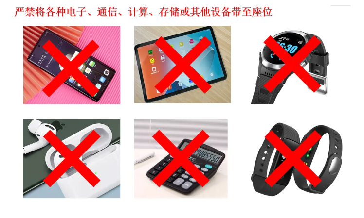 2.考生入座前,需按照要求將規(guī)定可攜帶文具以外的物品放在指定位置。手機(jī)等通訊工具應(yīng)關(guān)閉鬧鐘,并關(guān)機(jī)。嚴(yán)禁將手機(jī)、智能手表、智能手環(huán)、藍(lán)牙耳機(jī)等各種具有發(fā)送或者接收信息功能的通訊工具和具有計算、存儲功能的電子設(shè)備帶至座位。否則,無論是否使用均視為違紀(jì)??忌梢宰詡淦胀ǖ臋C(jī)械手表掌握時間。