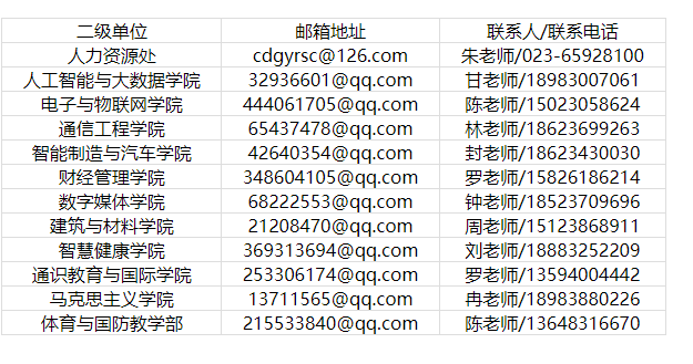 應(yīng)聘人員按要求向意向二級學院或人力資源處指定郵箱(見下表)發(fā)送報考材料完成報名,具體材料要求詳見《報考材料清單》(附件3)。
