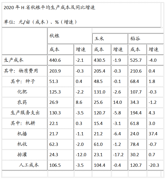 2020年,H省秋糧玉米和稻谷的市場平均交易價格分別為2.34元/公斤和2.74元/公斤,分別比上年上漲28.6%和8.7%。按此價格測算,2020年全省農(nóng)戶種植玉米、稻谷扣除成本前的產(chǎn)值分別為957.1元/畝、1520.7元/畝,分別比上年增長33.4%、8.9%。