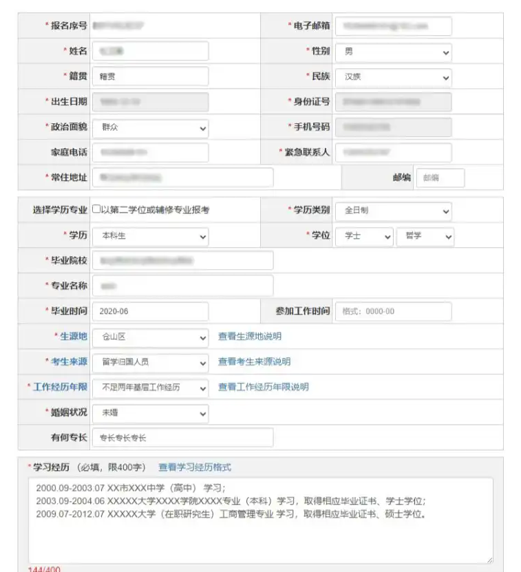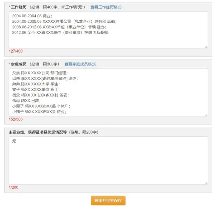 標(biāo)有“*”的項目為必填項目,報考者填寫的文字內(nèi)容不得超過限定的最大字符數(shù),并嚴格按照提示格式填寫。