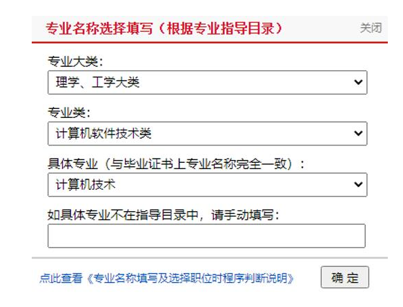 專業(yè)名稱填寫使用分級下拉框方式,先選擇專業(yè)大類,再選擇專業(yè)類,最后選擇具體專業(yè)。如具體專業(yè)不在選項中,請手動填寫具體專業(yè)名稱。