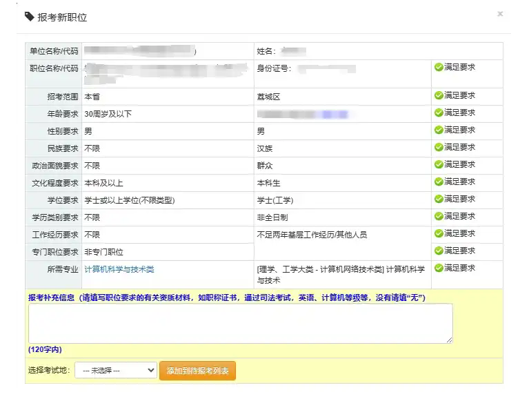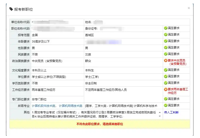 如果不滿足職位要求,報名系統(tǒng)會提示具體原因。