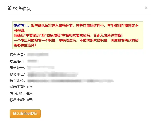 在彈出的新窗口中,點擊“確認報考此職位”按鈕,即報考成功,等待審核。