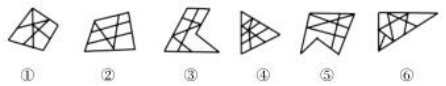 如上圖,圖形被分割成多個(gè)封閉區(qū)域,考慮面數(shù)量,面數(shù)量無(wú)法分成兩組,進(jìn)一步觀察發(fā)現(xiàn),每幅圖都有1個(gè)最大面,且圖①②⑥中最大面均為四邊形,圖③④⑤中最大面均為三角形。