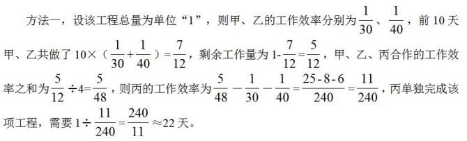 方法二,設(shè)該工程總量為120(30和40的最小公倍數(shù)),則甲、乙的工作效率分別為4、3。前10天甲、乙共做了10×(4+3)=70,剩余工作量為120-70=50,甲、乙、丙合作的工作效率之和為50÷4=12.5,則丙的工作效率為12.5-7=5.5,丙單獨(dú)完成該項(xiàng)工程,需要120÷5.5≈22天。故本題選B。