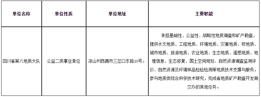 報(bào)名及資格審查地點(diǎn):四川省涼山州西昌市三岔口東路10號(hào)四川省第八地質(zhì)大隊(duì)辦公樓六樓人力資源部辦公室。