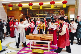 2025年1月21日,2025年“非遺賀新春——延邊過(guò)大年”系列活動(dòng)在延邊博物館啟動(dòng)?,F(xiàn)場(chǎng)設(shè)樂(lè)舞、指尖、舌尖三大板塊,展演、展示、品鑒精彩不斷,吸引眾多市民游客。圖為活動(dòng)啟動(dòng)當(dāng)日,朝鮮族做傳統(tǒng)打糕的場(chǎng)景展示。吉林省委宣傳部供圖 金由美/攝
