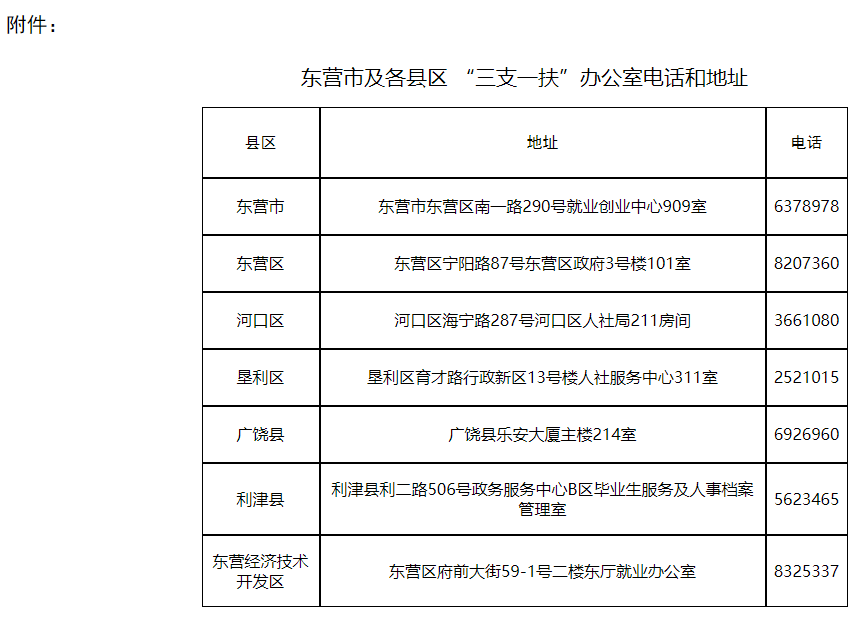 附件:東營(yíng)市及各縣區(qū)、開發(fā)區(qū)“三支一扶”辦公室電話和地址