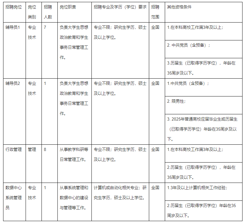 輔導(dǎo)員崗的筆試內(nèi)容為高等教育學(xué)、教師倫理學(xué)、大學(xué)心理學(xué)、高等教育法規(guī)基礎(chǔ)等專(zhuān)業(yè)知識(shí);行政管理崗位的筆試內(nèi)容為綜合基礎(chǔ)知識(shí);數(shù)據(jù)中心系統(tǒng)管理員的筆試內(nèi)容為綜合基礎(chǔ)知識(shí)和崗位所必須具備的專(zhuān)業(yè)知識(shí)。