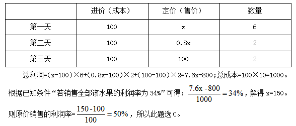 例2:超市銷售某種水果,第一天按原價售出總量的60%,第二天原價打八折售出剩下的一半,第三天按成本價全部售出。若銷售全部該水果的利潤率為34%,則該水果按原價銷售的利潤率為:( )