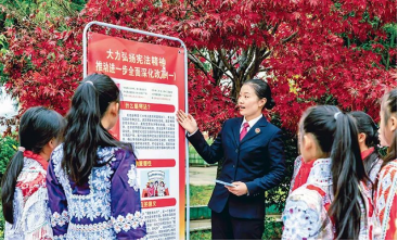 近年來,各地持續(xù)深化法治宣傳教育,增強全民法治觀念,助力法治中國建設。圖為2024年12月3日,貴州省黔西市人民檢察院干警在新仁苗族鄉(xiāng)化竹小學為學生普及憲法知識。新華社發(fā)范暉/攝