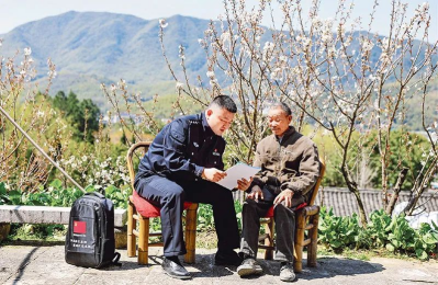 近年來,各地公安機關踐行新時代“楓橋經(jīng)驗”,創(chuàng)新開展“背包警務”等工作模式,為基層群眾排憂解難,推動矛盾糾紛化解。圖為2025年3月21日,浙江省余姚市公安局梁弄派出所民警通過“背包警務”進村入戶,開展安全防范宣傳。新華社記者 江漢/攝