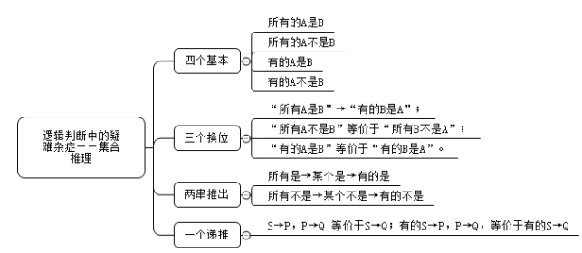 對于集合推理的學(xué)習(xí),我們需要從以下四個角度了解:四個基本,三個換位,兩串推出和一個遞推。接下來一一對這四個考點進(jìn)行解析。