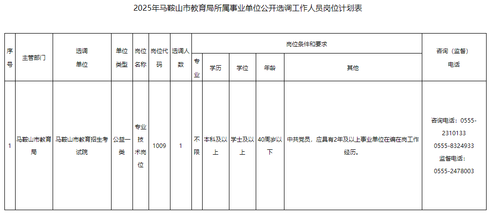 本次計劃面向全省教育系統(tǒng)公開選調(diào)事業(yè)單位工作人員1名。具體崗位及選調(diào)資格條件見《2025年馬鞍山市教育局所屬事業(yè)單位公開選調(diào)工作人員崗位計劃表》 (見附件)。