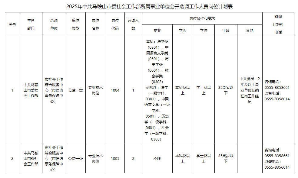 附件:2025年中共馬鞍山市委社會(huì)工作部所屬事業(yè)單位公開(kāi)選調(diào)工作人員崗位計(jì)劃表