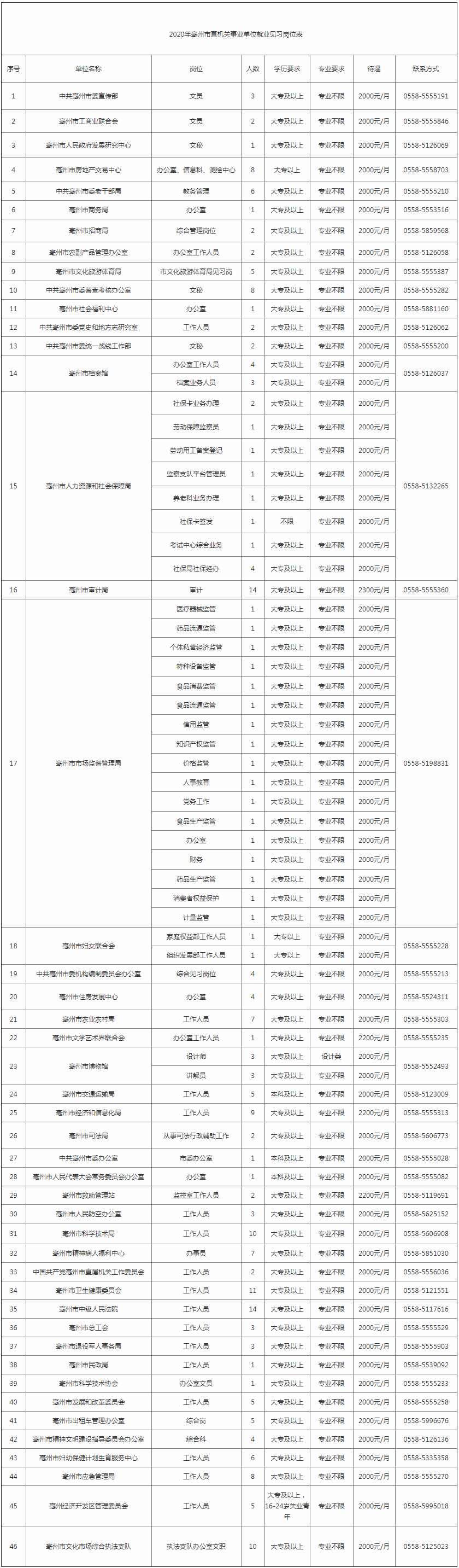 經(jīng)崗位征集審核,現(xiàn)將2020年市直黨政機關(guān)、事業(yè)單位(含公益一類、參公管理事業(yè)單位)就業(yè)見習(xí)崗位(詳見附件),招募就業(yè)見習(xí)崗位等信息于本公告發(fā)布之日起同步在亳州市人力資源和社會保障局網(wǎng)、亳州公共招聘網(wǎng)統(tǒng)一發(fā)布。