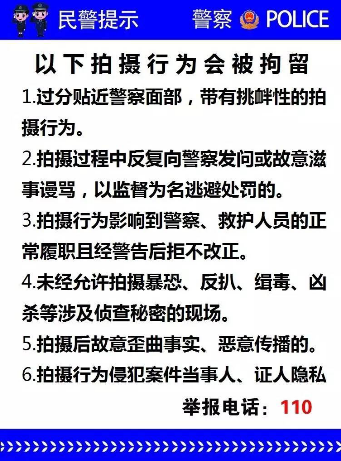 民眾也應該注意圍觀拍照應該有邊界意識。拍照不能影響警察的正常執(zhí)法行為。同時根據相關規(guī)定:“正在偵查、預審的刑事案件的具體案情和偵查、預審工作情況都屬于國家秘密”,其中包括案件的詢問、訊問筆錄,案件的現場勘查、現場照片、走訪調查等情況。因此不要拍攝敏感的案件現場或侵犯當事人的隱私。