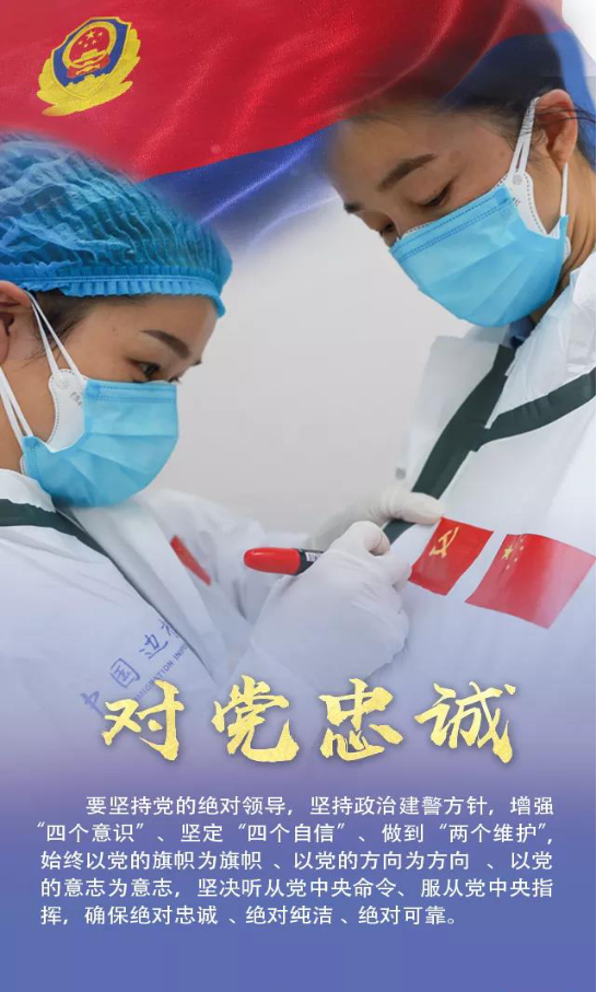 一是對黨忠誠。要堅持黨的絕對領(lǐng)導,堅持政治建警方針,增強“四個意識”、堅定“四個自信”、做到“兩個維護”,始終以黨的旗幟為旗幟、以黨的方向為方向、以黨的意志為意志,堅決聽從黨中央命令、服從黨中央指揮,確保絕對忠誠、絕對純潔、絕對可靠。