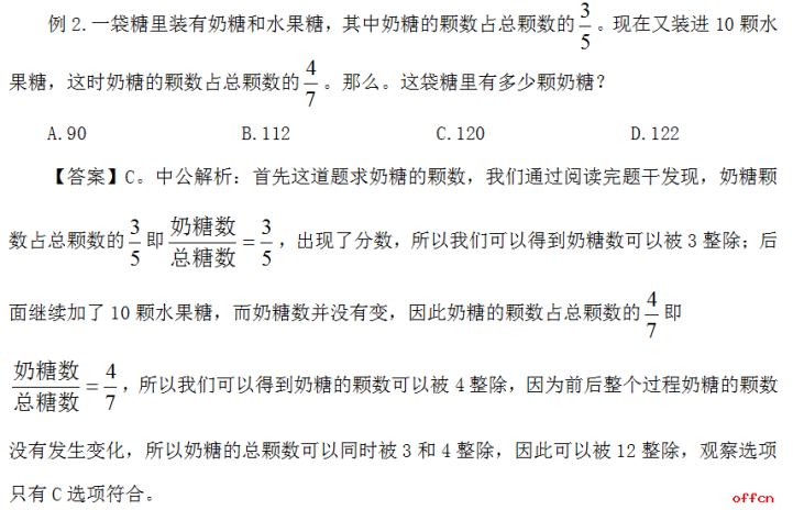 利用整除法去解題,不需要分析題干中的所有條件,不需要層層遞進(jìn)的分析題干中各種數(shù)量之間的關(guān)系,重點(diǎn)在于抓住題干中的一句話,或者一個(gè)簡(jiǎn)單的符號(hào)來(lái)分析問(wèn)題,排除錯(cuò)誤選項(xiàng),這也是整除法的核心。