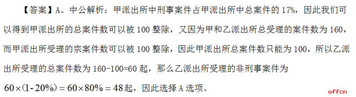 例3.兩個(gè)派出所某月共受理案件160起,其中甲派出所受理的案件中有17%是刑事案件,乙派出所受理的案件中有20%是刑事案件,問(wèn)乙派出所在這個(gè)月中共受理多少起非刑事案件?