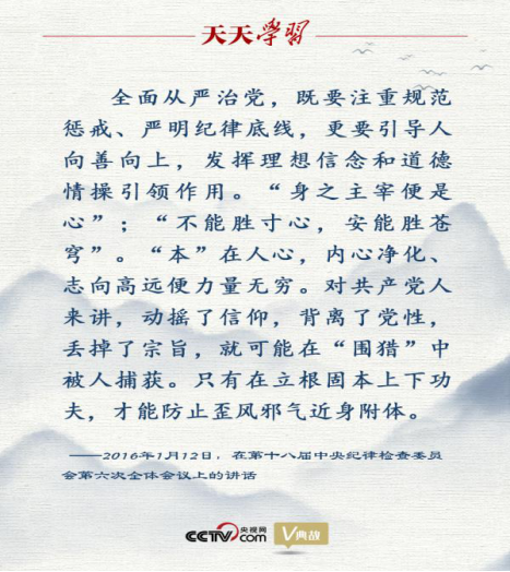 2016年1月12日,習(xí)近平總書(shū)記在十八屆中央紀(jì)委六次全會(huì)上發(fā)表重要講話。在講話中,習(xí)近平總書(shū)記站在新時(shí)代黨和國(guó)家事業(yè)發(fā)展全局的高度,引用中國(guó)古代廉政名言,深刻闡釋全面從嚴(yán)治黨等重大理論和實(shí)踐問(wèn)題,既直面問(wèn)題、切中時(shí)弊,又充滿自信、催人奮進(jìn),為深入推進(jìn)黨風(fēng)廉政建設(shè)和反腐敗斗爭(zhēng)提供了思想武器和行動(dòng)指南。