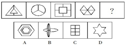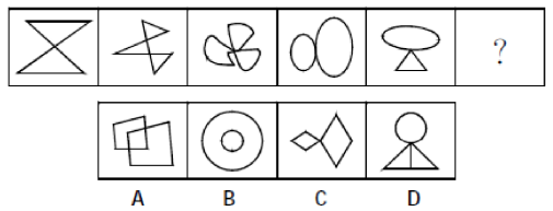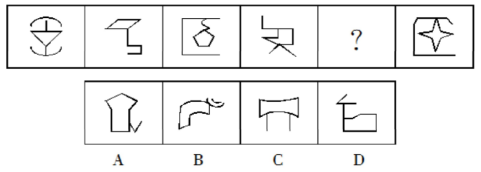 【參考解析】答案:C。觀察這道題目,每幅圖形均不相似而且圖形較為規(guī)整,首先想到的規(guī)律應(yīng)是對(duì)稱性,但ACD均為對(duì)稱圖形,排除這個(gè)思路;其次我們會(huì)發(fā)現(xiàn)每幅圖形均含有多個(gè)封閉區(qū)域,便會(huì)思考到封閉區(qū)域的數(shù)量,這道題目封閉區(qū)域的數(shù)量為3、3、5、5,這時(shí)大家會(huì)考慮到有可能是呈等差數(shù)列的封閉區(qū)域數(shù),下面兩幅圖形的封閉區(qū)域?yàn)?、7,驗(yàn)證選項(xiàng)可知并無答案。各位考生先別放棄,通過仔細(xì)觀察選項(xiàng),不難發(fā)現(xiàn)其中的特殊之處,圖一中有兩個(gè)形狀相同的封閉區(qū)域,圖二中有三個(gè)形狀相同的封閉區(qū)域,以此類推便可找出答案,本題考查的是相同形狀的封閉區(qū)域數(shù),因此答案選擇C。