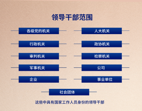 領(lǐng)導(dǎo)干部是指在各級(jí)黨的機(jī)關(guān)、人大機(jī)關(guān)、行政機(jī)關(guān)、政協(xié)機(jī)關(guān)、審判機(jī)關(guān)、檢察機(jī)關(guān)、軍事機(jī)關(guān)以及公司、企業(yè)、事業(yè)單位、社會(huì)團(tuán)體中具有國(guó)家工作人員身份的領(lǐng)導(dǎo)干部。