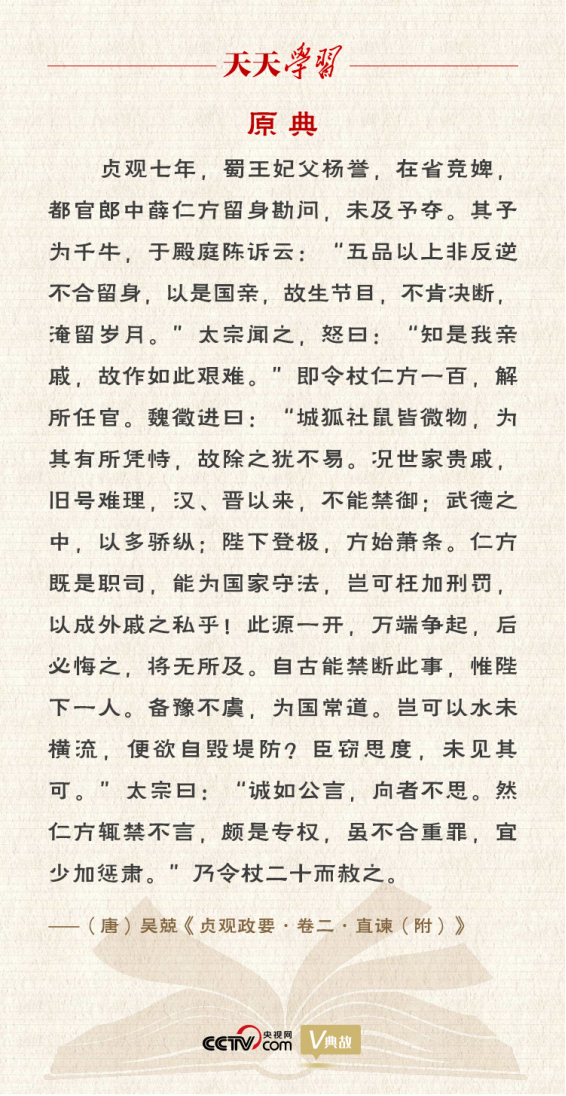 魏徵覺得唐太宗的做法非常不妥,便進諫道:“薛仁方作為國家官吏,奉公守法,怎么能夠枉加處罰,讓外戚的私欲得逞呢?此例一開,事端爭起,將來必然追悔莫及?!眲裰G太宗“備豫不虞,為國常道”,太宗聽后有所觸動。