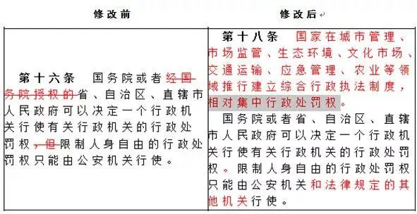 ?明確了相對(duì)集中行使行政處罰權(quán)的領(lǐng)域,在行政處罰法中確認(rèn)了多年來綜合執(zhí)法制度改革的成果;決定行政機(jī)關(guān)行使行政處罰權(quán)的機(jī)構(gòu)刪除了“經(jīng)國務(wù)院授權(quán)的”;增加了限制人身自由的行政處罰權(quán)的行使機(jī)關(guān)——法律規(guī)定的其他機(jī)關(guān)。