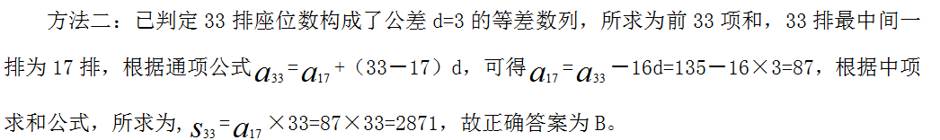 【答案】B?!窘馕觥?/span>方法一:由題干可知,共有33排座位,后一排比前一排多3個(gè),即從第二排開(kāi)始,后一排座位數(shù)減前一排座位數(shù)為定值3,說(shuō)明33排座位數(shù)構(gòu)成了公差d=3的等差數(shù)列,已知