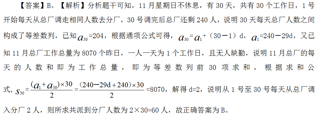 【例2】某工廠(chǎng)11月份工作忙,星期日不休息,而且從第一天開(kāi)始,每天都從總廠(chǎng)陸續(xù)派相同的工人到分廠(chǎng)工作,直到月底,總廠(chǎng)還剩工人240人。如果月底統(tǒng)計(jì)總工廠(chǎng)工人的工作量是8070個(gè)工作日(一人工作一天為1個(gè)工作日),且無(wú)人缺勤,那么,這月由總廠(chǎng)派到分廠(chǎng)工作的工人共有多少人?( )