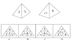 31、如圖所示是從兩個(gè)不同角度觀察到的同一個(gè)正四面體的外表面,將該四面體展開(kāi),可能得到的圖形是( )。