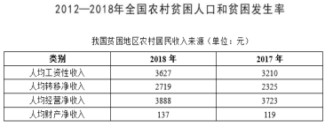 黨的十八大以來(lái),脫貧工作取得巨大成效,全國(guó)農(nóng)村貧困人口大幅減少。截至2018年末,全國(guó)農(nóng)村貧困人口從2012年末的9899萬(wàn)人減少至1660萬(wàn)人;農(nóng)村貧困發(fā)生率從2012年的10.2%下降至1.7%,累計(jì)下降8.5個(gè)百分點(diǎn)。