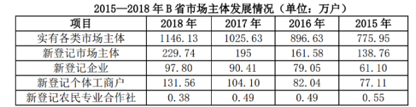 近年來(lái),B省營(yíng)商環(huán)境不斷優(yōu)化,市場(chǎng)活力不斷增強(qiáng),新登記市場(chǎng)主體保持較快增長(zhǎng)勢(shì)頭。2018年,全省新登記市場(chǎng)主體229.74萬(wàn)戶,日均新登記市場(chǎng)主體6294萬(wàn)戶,同比增長(zhǎng)17.82%。