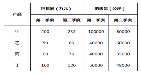 某水產(chǎn)公司共銷售甲、乙、丙、丁四種魚類產(chǎn)品。其在兩個(gè)季度的銷售額和銷售量情況如下: