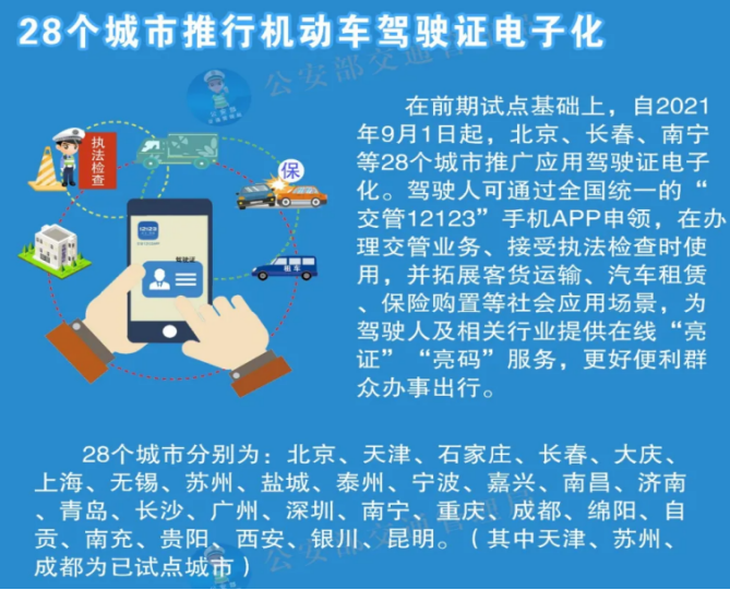 北京等28個城市推行機動車駕駛證電子化。在前期試點基礎(chǔ)上,北京、長春、南寧等28個城市推廣應(yīng)用機動車駕駛證電子化。通過全國統(tǒng)一的“交管12123”APP發(fā)放電子駕駛證,電子駕駛證在全國范圍內(nèi)有效,辦理交管業(yè)務(wù)、接受執(zhí)法檢查時出示使用,并拓展客貨運輸、汽車租賃、保險購置等社會應(yīng)用場景,為駕駛?cè)颂峁┰诰€“亮證”“亮碼”服務(wù),進一步簡化辦事手續(xù)資料,提升證件使用便捷度,更好便利群眾辦事出行。此后,將陸續(xù)在全國范圍內(nèi)分階段實施。