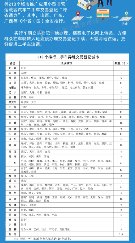 石家莊等218個城市推行二手車異地交易登記。經(jīng)商商務(wù)部、國家稅務(wù)總局,在天津、太原、沈陽、上海等20個城市試點推行小型非營運載客汽車二手車交易登記“跨省通辦”基礎(chǔ)上,北京、石家莊、濟南等218個城市推廣應(yīng)用,其中,山西、廣東、廣西等10個?。▍^(qū))全省推行。對二手車需要在異地交易的,實行二手車交易登記一地辦理、檔案電子化網(wǎng)上轉(zhuǎn)遞,實現(xiàn)二手車全國范圍內(nèi)跨省跨市異地交易登記,無需兩地往返,更好促進二手車流通。