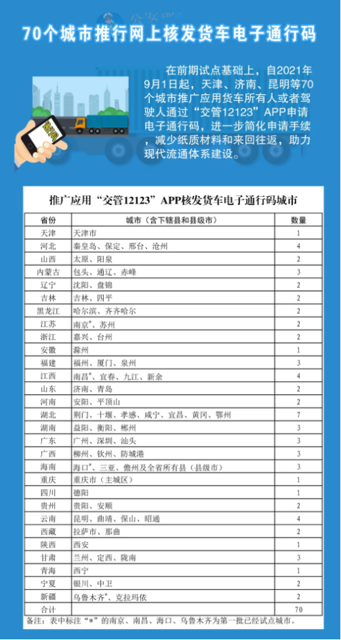 天津等70個城市推行網(wǎng)上核發(fā)貨車電子通行碼。在南京、南昌、海口、烏魯木齊4個城市試點貨車所有人或者駕駛?cè)送ㄟ^“交管12123”APP申請電子通行碼基礎(chǔ)上,天津、濟南、昆明等70個城市推廣應(yīng)用“交管12123”APP核發(fā)貨車電子通行碼,進一步簡化申請手續(xù),減少紙質(zhì)材料和來回往返,助力現(xiàn)代流通體系建設(shè)。