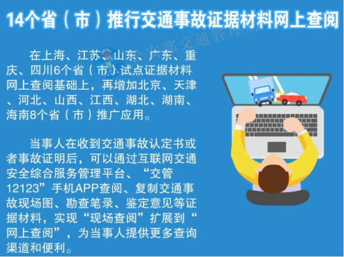 河北等14個?。ㄊ校┩菩薪煌ㄊ鹿首C據(jù)材料網(wǎng)上查閱。在上海、江蘇、山東、廣東、重慶、四川6個省(市)試點證據(jù)材料網(wǎng)上查閱基礎(chǔ)上,再增加北京、天津、河北、山西、江西、湖北、湖南、海南8個?。ㄊ校┩茝V應(yīng)用。當事人在收到交通事故認定書或者事故證明后,可以通過互聯(lián)網(wǎng)交通安全綜合服務(wù)管理平臺、“交管12123”APP查閱、復制交通事故現(xiàn)場圖、勘查筆錄、鑒定意見等證據(jù)材料,實現(xiàn)“現(xiàn)場查閱”擴展到“網(wǎng)上查閱”,為當事人提供更多查詢渠道和便利。