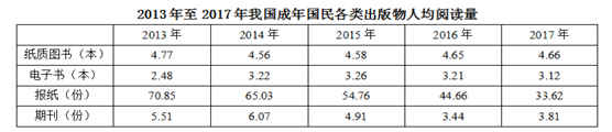 2017年我國成年國民圖書閱讀率為59.1%,比上年增加0.3個百分點;報紙閱讀率為37.6%,比上年降低2.1個百分點;期刊閱讀率為25.3%,比上年增加1個百分點。