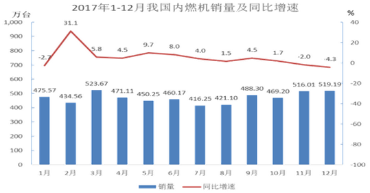 2017年1~12月,全國內(nèi)燃機累計銷量5645.38萬臺,同比增長4.11%,累計完成功率266879.47萬千瓦,同比增長9.15%,其中柴油內(nèi)燃機功率同比增長34%。