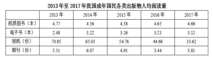 A、2013年至2017年我國成年國民人均電子書閱讀量逐年上升