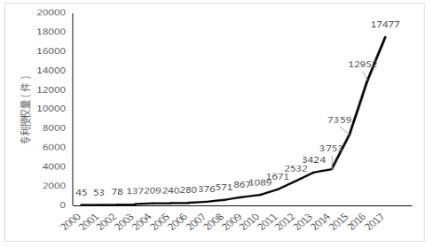 圖1 2000-2017年中國人工智能專利授權情況(單位:件)