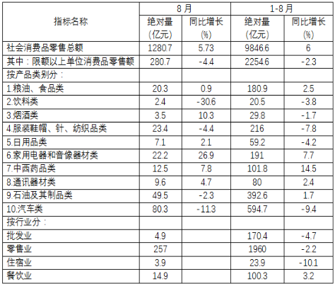 2019年1-8月,遼寧省社會消費(fèi)品零售總額9846.6億元,比上年同期增長6.0%,增速回落1.6個百分點(diǎn)。限額以上單位消費(fèi)品零售額實(shí)現(xiàn)2254.6億元,同比下降,增速回落6.5個百分點(diǎn)。