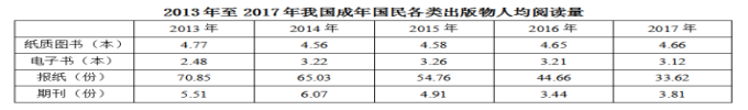 D. 2017年我國(guó)成年國(guó)民人均每天閱讀紙質(zhì)圖書時(shí)長(zhǎng)低于閱讀報(bào)紙與閱讀期刊時(shí)長(zhǎng)之和
