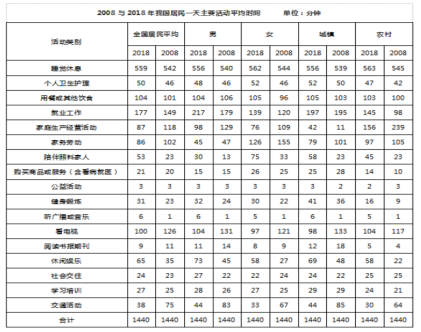 C. 與2008年相比,2018年我國(guó)城鎮(zhèn)居民花費(fèi)在工作和勞動(dòng)上(就業(yè)工作、家庭生產(chǎn)經(jīng)營(yíng)活動(dòng)、家務(wù)勞動(dòng)的合計(jì)數(shù))的平均時(shí)間減少了,花費(fèi)在休閑活動(dòng)上(健身鍛煉、聽廣播和音樂、看電視、閱讀書報(bào)期刊、休閑娛樂的合計(jì)數(shù))的平均時(shí)間增加了