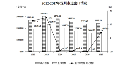 D、2017年,深圳市進(jìn)出口總額同比增加157.07億美元