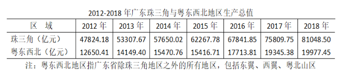 B、2012-2018年,珠三角與粵東西北地區(qū)生產(chǎn)總值的差距逐年縮小